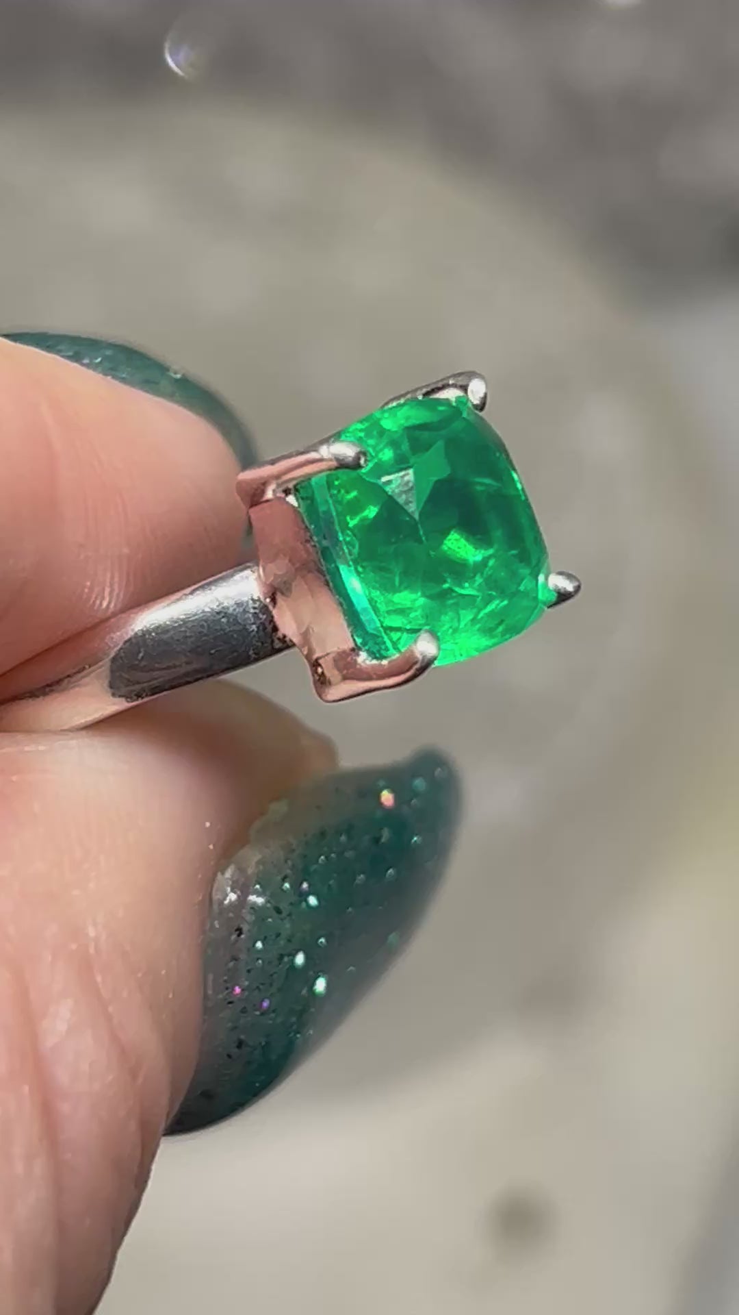 Captivating cushion cut natural emerald that has been heat treated to enhance color, set in a sterling silver band. Stamped 925 size 7.
